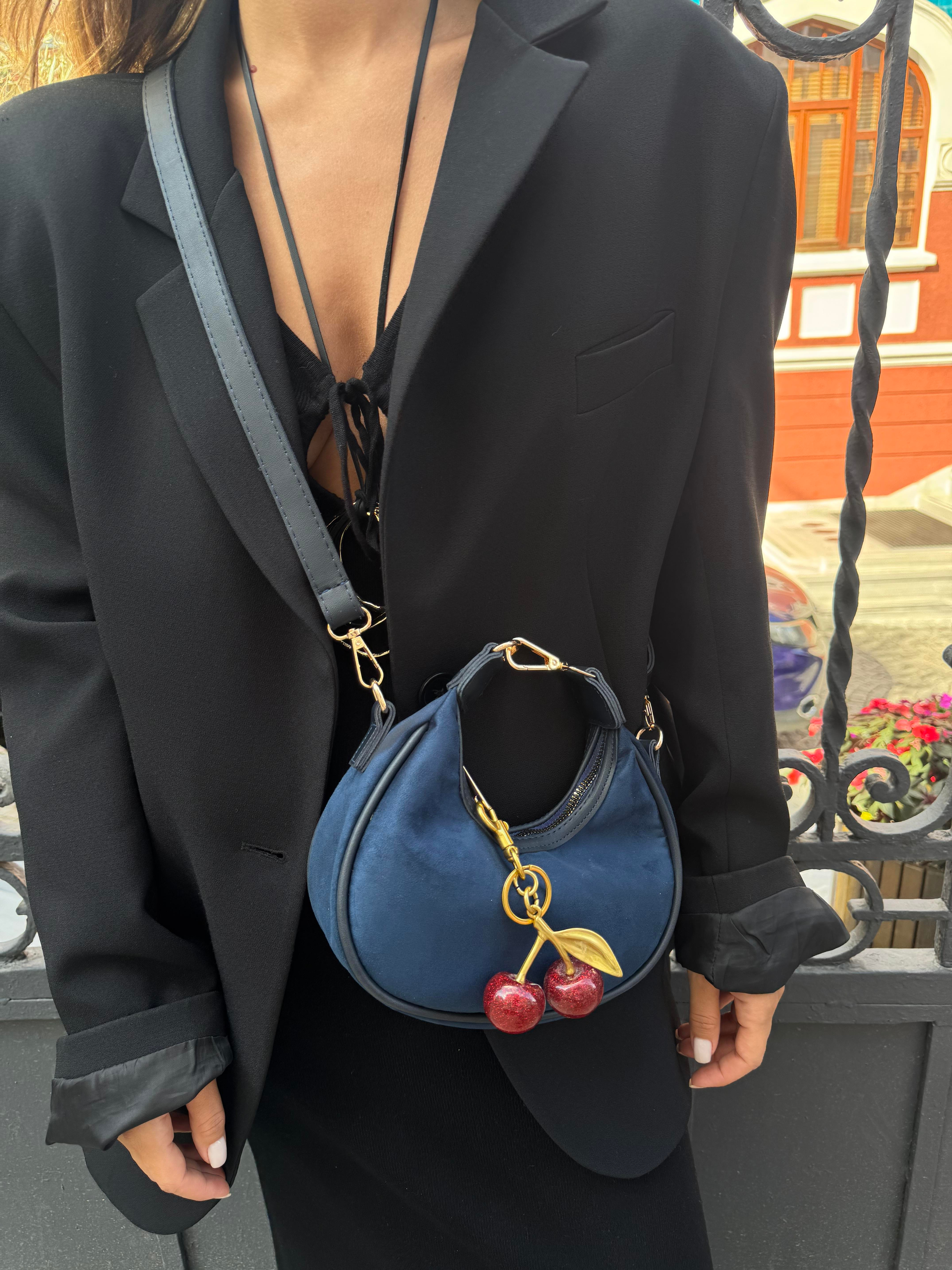 Kiraz Charm'lı Süet Kadın El Ve Omuz Çantası Lacivert