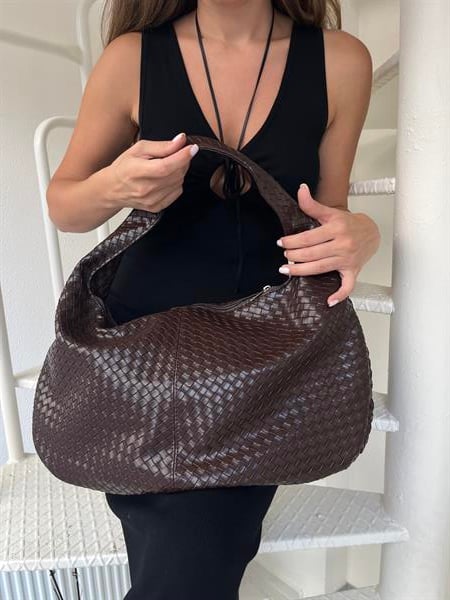 Örgü Dokulu Fermuarlı Büyük El Ve Omuz Çantası Acı Kahve