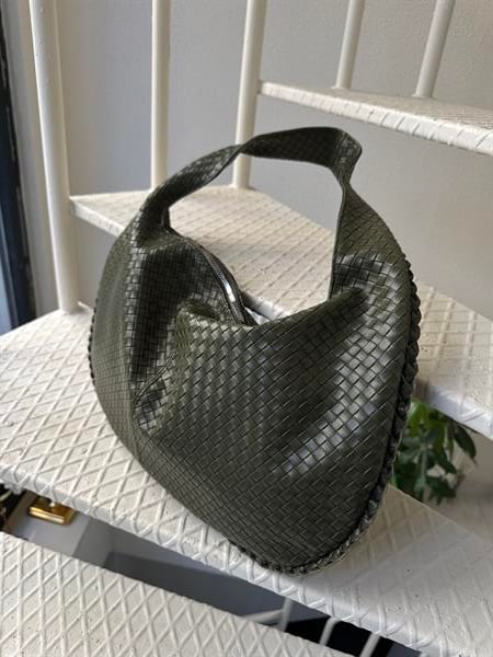 Örgü Dokulu Fermuarlı Büyük El Ve Omuz Çantası Haki